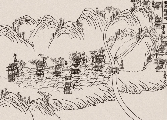 乾隆本《简州志》中的龙泉驿图,凤仪书院在图右侧金泉寺旁。