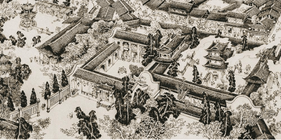 图中间为凤梧书院,描绘了学生们在元宵节时猜灯谜的场景。图左为乡镇少见的公园,图右为三清庙。