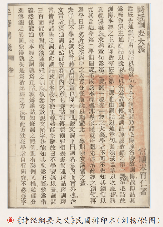 《诗经纲要大义》4卷是宋育仁关于《诗》学的研究,他认为治经首先要通晓训诂,训诂是理解经典文句的关键。以《毛诗》为例,训诂是解读经典的首要任务,通过训诂可避免对文字的误解,进而理解章句。同时,他指出需要把握经典的微言大义,不能仅局限于细枝末节,要结合训诂与经典大义系统讲解,以促进对学术的深入理解。目前尚存的《诗经纲要大义》为残卷,现存的版本为民国排印本,存于四川大学图书馆。