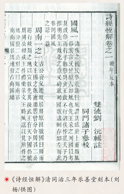 刘沅《诗经恒解》中解《诗》主要以阐发义理为主,在阐释诗篇主旨时,注重依照孔孟之说理解诗篇的本意,“以圣人为依”,不采纳后世经学阐释中的曲折附会、穿凿矫饰之说,而是依据孔子录《诗》以垂教后世之意,对诸家之说进行辩说,其立论多有新意,发前人之所未发之言。文中多处提及“今取合圣人之意者存之,他不尽录”“故宁异于前人,不敢侮圣人之意”。如解《汝坟》中“汝水”之名,便引孟子“决汝汉而注之江”的言论,提出诗中所言之“汝水”,并非出于汝州而注于淮河的“汝州之汝”,而是其他名为“汝水”的河流,这是因为水道常常迁徙,古今水名有所不同而造成的。在《江有汜》附解中,依据“孔孟之言”对孔疏中“滕”的阐释进行了辨识。《左传》中记载,凡诸侯嫁女,同姓之国将派出宗女“滕”之。孔疏中将“滕”解释为“妾”。而刘沅根据“孔孟未言(此事)”,指出以同姓之女陪嫁,是春秋末年礼法混乱的表现,并非古礼。同时他还依据四川建昌等地嫁女之时要让侄娣送新娘到夫家,送到之后即返回这样的风俗来证明,所谓“滕”,只是陪同送嫁之人,并非妾的身份。这样的创新性阐释还有很多。《续修四库全书总目提要》中对其解《有枤之杜》《山有扶苏》《扬之水》《出其东门》诸篇评价较高,称其阐释“要为近理”“尤具卓识”。