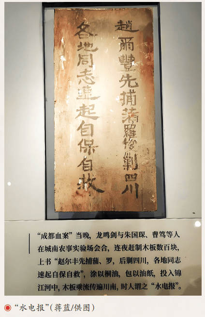 具体情形是,3人分头行动,连夜整理出200多块小木板,各自奋笔疾书,在木板上写下十万火急的21个字:“赵尔丰先捕蒲罗后剿四川,各地同志速起自保自救”。农事实验场里储备有不少桐油。他们立即在字迹风干后的木板上涂抹桐油,以防字迹被水浸蚀而漫漶。直到黎明前,才完成200多块小木板的书写、上油,然后投入锦江……长27厘米、宽13厘米的小木板,负载着多么重的期盼!