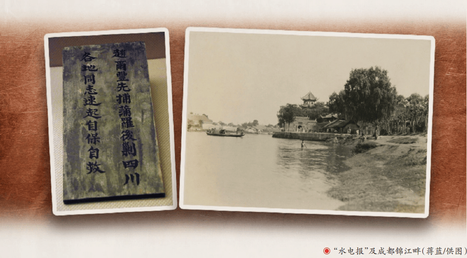 “成都血案”发生后,赵尔丰封锁一切消息,关闭邮电、全城戒严,城楼上加派重兵把守,任何人不得出城,“城墙日夜防守,不准一人登城。”当晚,曹笃来到成都电报局去派发电报,但赵尔丰严令之下,邮电局早已关门。发“电报”未果的曹笃,念兹在兹,才去和龙鸣剑汇合。两人悄悄爬上东城墙,用绳子吊下城墙,匆匆赶到九眼桥附近的农事实验场与朱国琛商量应急之策。鉴于路途遥远,派人送信外出估计不可行,信使即便顺利出城,也不能及时通知到区域漫长的四川各州县。3人茫然无绪,拿起桌子上的一罐叙府酒,默默喝起来,以泄苦闷……午夜时分,曹笃出门上厕所时,借着微弱天光,偶然看到路边堆放有上百片长条式小木板(竹片),那是农事实验场用来书写标明每一畦地栽种的品种说明木片。1911年9月初,尚是锦江的丰水期,濯锦之水沉默而无声地流淌着,没能拍发出电报的曹笃,急忙返屋与龙鸣剑和朱国琛商量:既然电报发不成了,“水电报”是否可行?锦江汇入岷江后,在宜宾入金沙江,从长江可以直达重庆等地。几人精神为之大振,齐声说:整得好!三人立即把警报写在木板上,再投进锦江……