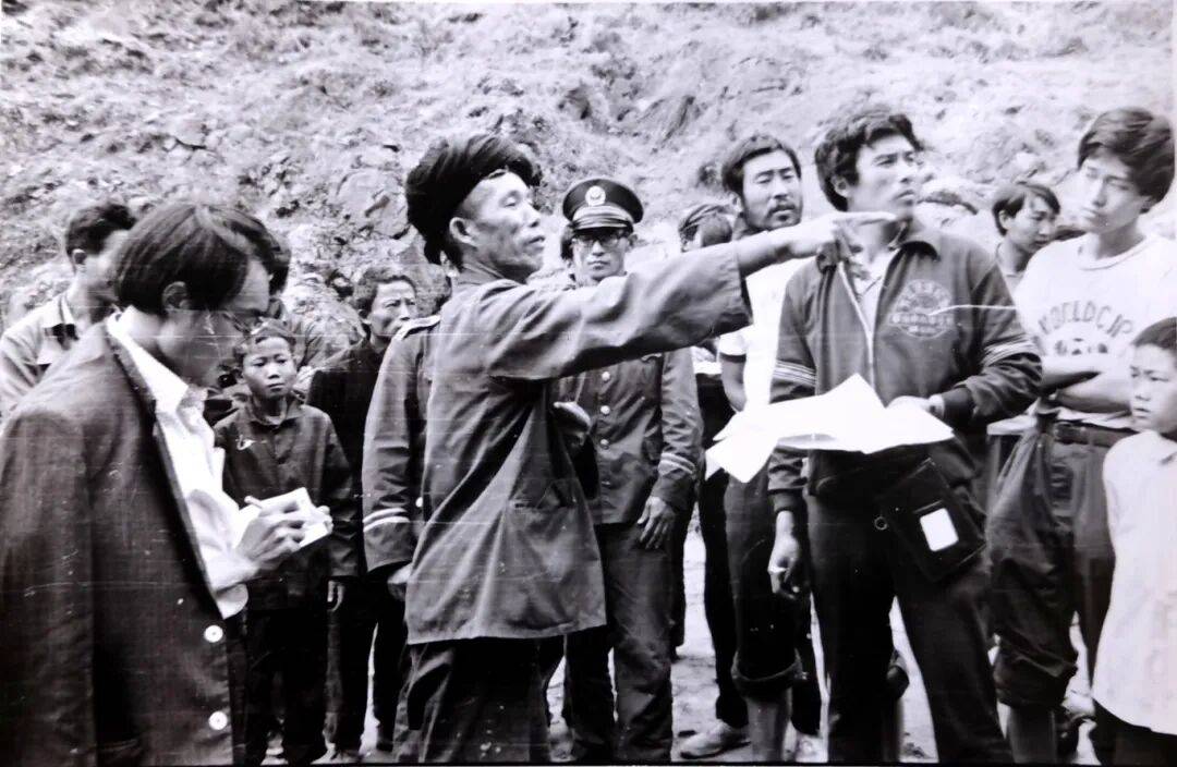 村民在老君滩口向雷健生(右四)、王茂军(五)介绍水情,前左一为作者奉友湘(奉友湘 供图)