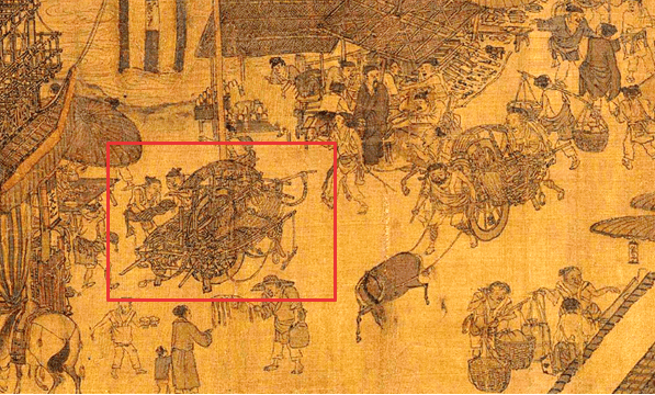 北宋画家张择端绘《清明上河图》(局部),中央近景为运钱车(故宫博物院 藏)