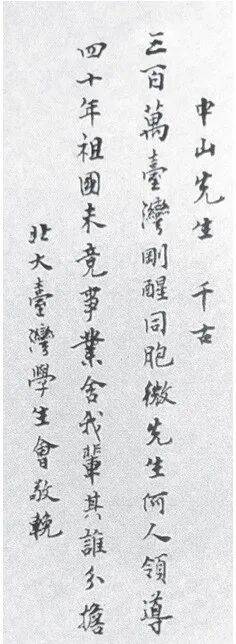 当时北京大学台湾学生会撰写的挽联为:“三百万台湾刚醒同胞,微先生何人领导?”“四十年祖国未竟事业,舍我辈其谁分担!”横额为“中山先生千古”。挽联与横额,充分表达了台湾同胞对孙中山逝世的悲痛心情,以及决心继承孙中山的革命遗志,完成祖国统一的心愿。