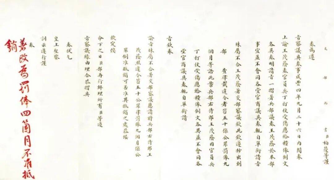 咸丰帝发现,在王茂荫于咸丰四年(1854)九月二十六日上的一道奏折中,他没有会同兵部各堂官商议,又“单衔(单独署名)请旨”,显然犯了跟之前一样的错误。这次也不用王茂荫自请“交部严加议处”了,咸丰帝特下谕旨“交部察议”定罪。十月初六日,吏部尚书柏葰上折《奏为遵旨察议兵部右侍郎王茂荫处分事》,提出给予王茂荫“违令笞五十公罪律,罚俸九个月”的处分,并就罚俸可否抵销请示咸丰帝。所以王茂荫的处分确实有“笞五十”的记录,马克思的担心不无道理。按照大清律法,官员被定为公罪的,罚俸可用本人的加级记录抵销,而获私罪不准抵销。王茂荫是犯了公罪,可以“例准抵销”,但咸丰帝朱批“改为罚俸四个月,不准抵销”。紧接着,王茂荫“任内因失察户部井田科换钞舞弊案”降一级留任、因“奏请暂缓临幸圆明园”降四级留任。本来只有四个月的罚俸,也从咸丰四年(1854)九月二十六日(王茂荫单衔请旨那天)连扣至咸丰八年(1858)二月初七日,且直到当年七月才准其开复,而他又因病申请开缺。此后,他虽然在同治朝再度被启用,并提为从一品大员,但仅三年就结束了政治生涯。