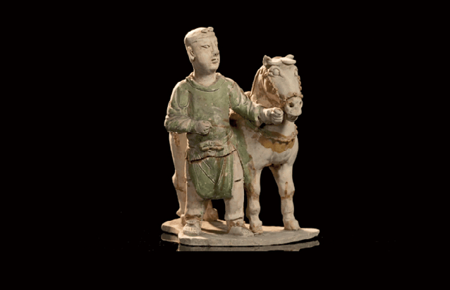 三级文物。宋代,陶器。高23.5厘米,长26厘米,宽8厘米。人高27.2厘米,肩宽8厘米,胸厚5厘米。1978年5月,原五星乡犀羊村3组出土。此俑牵马者头扎头巾,身着圆领绿长衫,腰结带,左手牵马,右手持握拳状于胸前,马鞍、马镫俱全。