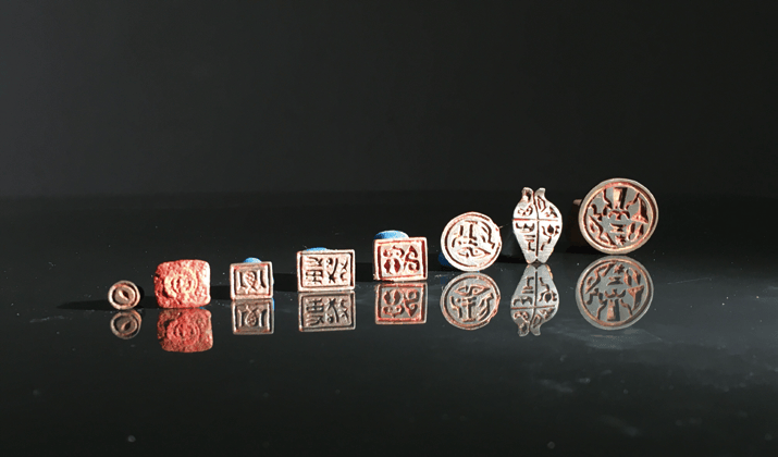 一级文物。战国,铜器。1998年1月,在蒲江县鹤山镇飞龙村6组出土。至2022年末,在蒲江县出土巴蜀图语印章20余枚。图片右2的铜印尤具特色,该铜印长3厘米,宽1.9厘米,厚0.2厘米,重10克。形制奇特,为鱼形,张开的鱼嘴,肥硕的鱼身,燕尾似的尾鳍向上翘。印面有十字界格,把阴刻的图语划分为4组。图语左上方是1条蠕动曲身正在吐丝的蚕,古蜀人将符号作为自己氏族的图腾,这里的蚕可能代表古蜀国蚕丛氏。印面的左下方刻火焰。火象征光明,可能代表古蜀国开明王朝。图语右上方的竖立的梯形,分析当是表示这位伯爵封疆的山川形胜平面示意图,三蒂纹表示五等爵位中第三等伯爵之印。右下方图语,是1件倒立铎。铎倒立,表示正用手举起铎摇动,在“振铎”发号施令。