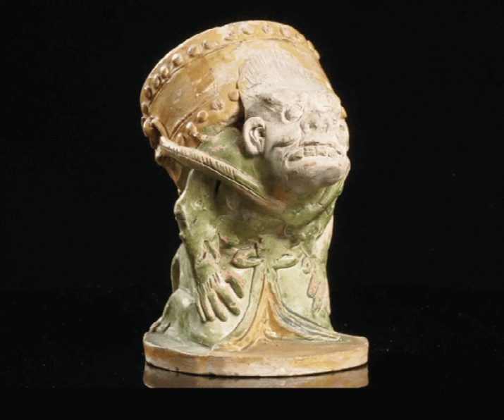 一级文物。宋代,陶器。高16.2厘米,宽12厘米,长13厘米,跪高11厘米,鼓直径7.5厘米,厚5.7厘米。1979年,在蒲江县寿安镇出土。此负鼓俑负鼓人跪地,双手抚膝,裸上身,鼓眼、翘鼻、张口露齿、背负大鼓、赤足。