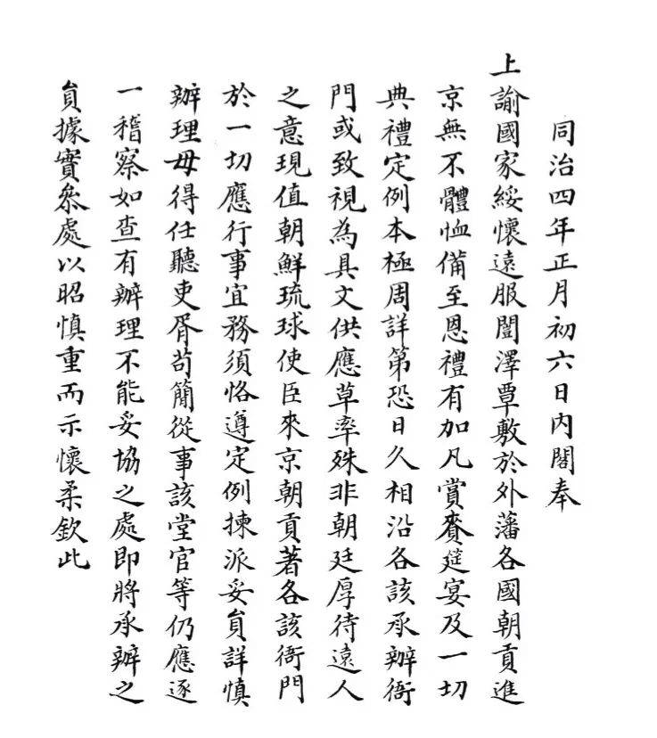 清同治四年(1865)正月初六日,同治帝着各衙门详慎办理琉球等国朝贡事宜的上谕(中国第一历史档案馆 藏)