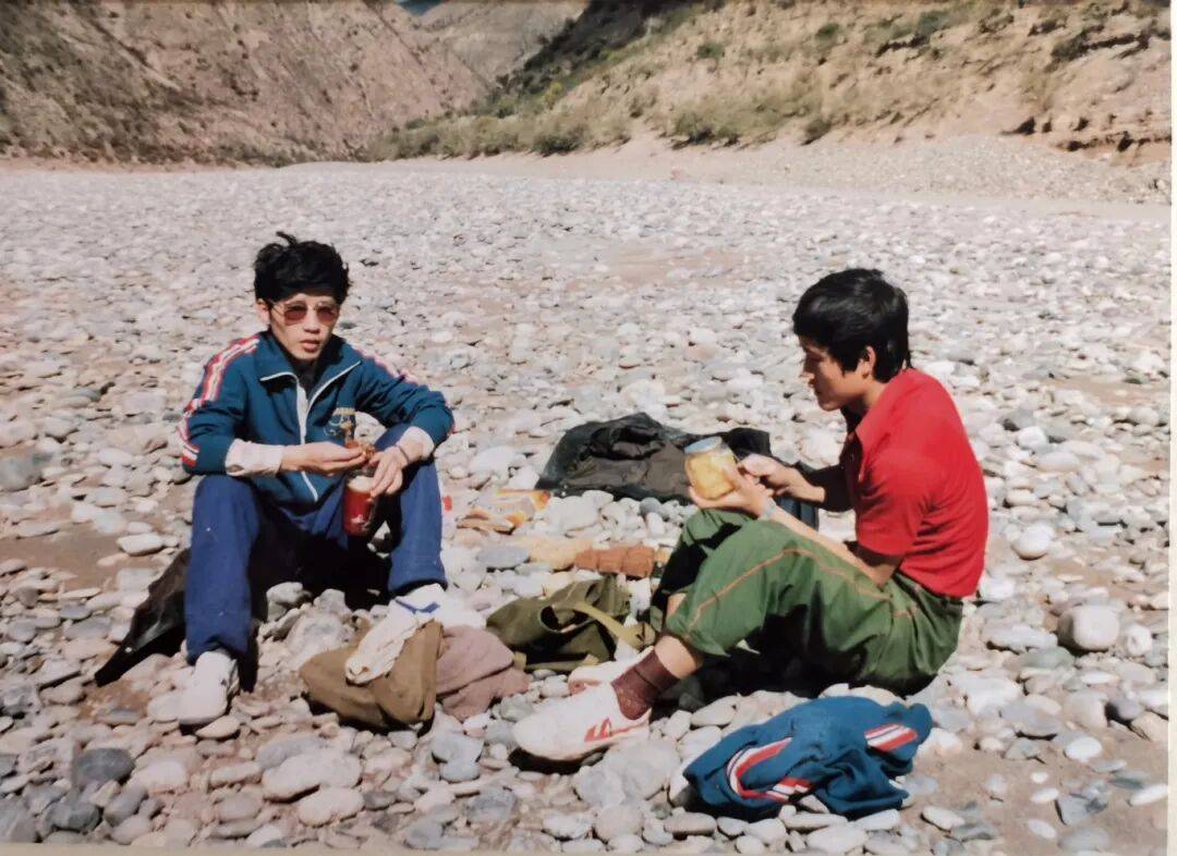 王振(左)、何景树(右)在巴塘金沙江邦扎滩沙滩上的午餐(奉友湘 供图)