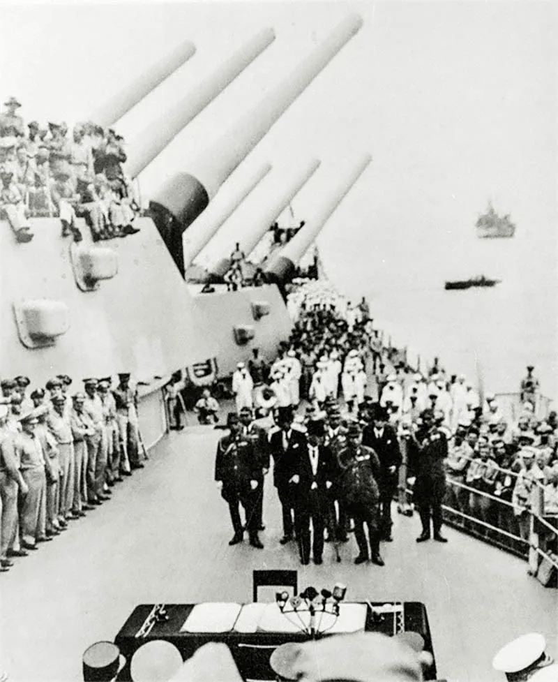 1945年9月2日,日本代表在东京湾美国“密苏里”号战列舰上签署投降书。