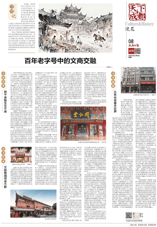 成都的中医药文化,源远流长,生生不息。从天回镇汉墓出土的“天回医简”“扁鹊医书”,见证了这片土地2000多年前的医学智慧。这份深厚的底蕴,历经千年沉淀,并未尘封于历史,反而在街巷间蓬勃生长。明清以来,成都及周边街巷里药铺林立,至近代更涌现出“同仁堂”“德仁堂”等百年老字号。店门前“遵古炮制”的金字匾额,是对传统的坚守;门庭若市的景象,则诉说着百姓的认可。从“天回医简”的古方到老字号门柜前的熙攘,其间传递的,不仅是“医者仁心”的文化精髓与独步蜀中的炮制技艺,更有因诚信经营、精工良药而孕育出的持久商业繁荣,展现了文化遗产与城市经济活力交织的生动篇章。如今,依然有不少百年老字号中医药企业活跃在城市之中,并融入了老百姓的日常生活里。