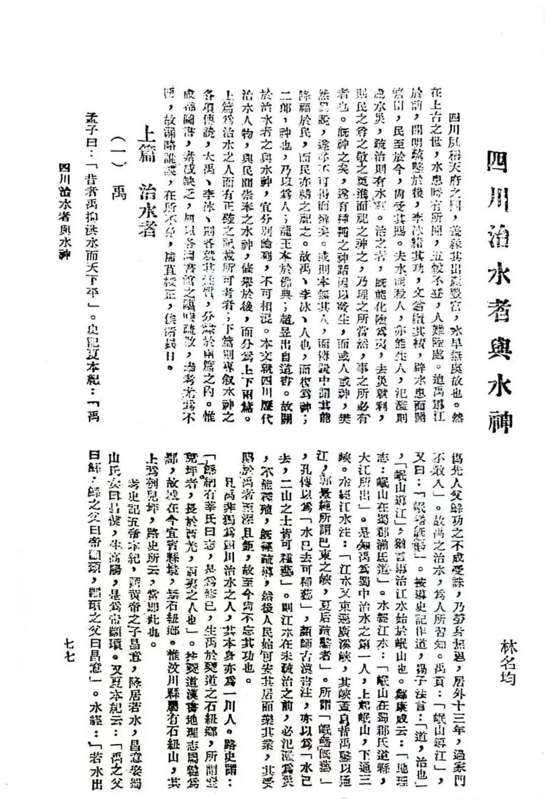 1934年3月,林名均陪同葛维汉到广汉,开始了三星堆遗址的科学发掘工作,是月亮湾遗址发掘的具体组织实施者,并负责修复陶器和草拟发掘简报等工作,是从事三星堆考古发掘的中国第一人。这篇文献资料是林名均撰写的关于李冰治水的文章。