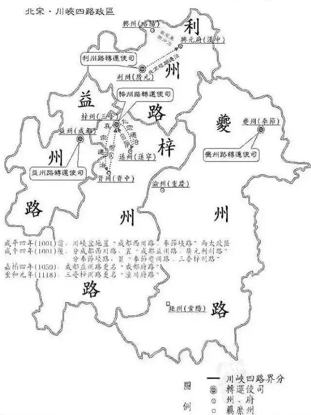 宋真宗咸平四年(公元1001年)设益、梓、利、夔四州路,治所分别为今成都、三台、汉中和奉节。这四路,一般称为川峡四路,或略称为川峡。