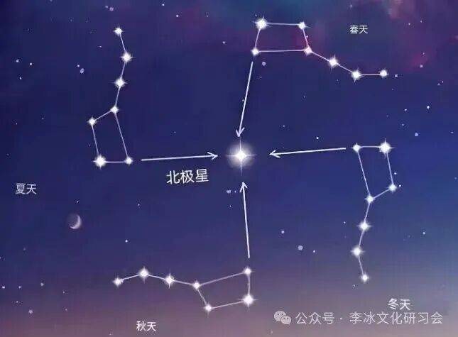 北斗星围绕北极星旋转,一年四季斗柄指向四方。