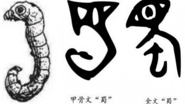 甲骨文的“蜀”字,其中单个的蚕形,即为野蚕。盛产野蚕的山,也就叫作“蜀山”。这就是蜀人、蜀山称谓的来源。这样看来,“蜀”其实就是桑树上的野蚕,它是现代家蚕的直接前身。随着文化的进化,蜀人发现野蚕可以变为吐丝家养的家蚕,从而发明了栽桑养蚕之法,将其驯化成为能吐丝织绸的家蚕。甲骨文“蜀”字又有众蚕相聚在一目之下,是丝工眼下丛聚养丝蚕的图形。