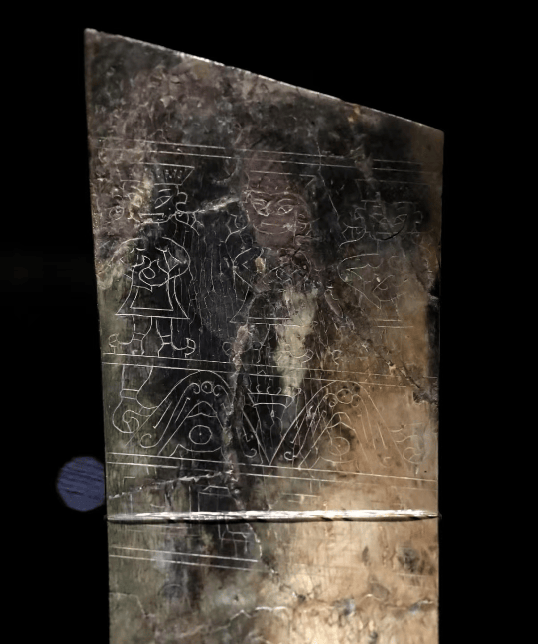 之前学界认为,三星堆出土的大型玉璋纹饰是三星堆人祭山仪式的图案,笔者认为这不是祭山仪式图案,而是展示了古蜀人认为天彭阙为灵魂经过之处,以及古蜀船棺、天极崇拜等元素。此图案的两座山之间的小船就是后来古蜀人的载魂之舟——古蜀船棺,两座山即为后来《蜀王本纪》中记载的:“李冰以秦时为蜀守,谓汶山为天彭阙,号天彭门。云亡者悉过其中,鬼神精灵数见。”的天彭阙。古蜀人认为只有经过天彭阙,灵魂才能获得重生。在两山也就是天彭阙的最左边,是一个大拇指翘起的握拳手势,这个特殊的手势出现在三星堆出土的众多文物上。此握拳手势就是在模拟北斗七星造型,握住的手掌四指正好是一个方形的斗魁四星:天枢、天璇、天玑、天权,翘起的大拇指三个关节正好为斗柄三星:玉衡、开阳、瑶光。前文已叙述北斗也被视为天极,天极是阴阳和合,生化万物之处。船棺载着三星堆人的灵魂经过天彭阙返回天极,那里是他们灵魂出发的地方,万物复归于一,三星堆人回到这里将获得灵魂的重生,进入生命的下一个轮回。因此玉璋的小船图案就是后来的古蜀船棺,这是一幅完整体现三星堆人世界观与人生观的叙事史诗。