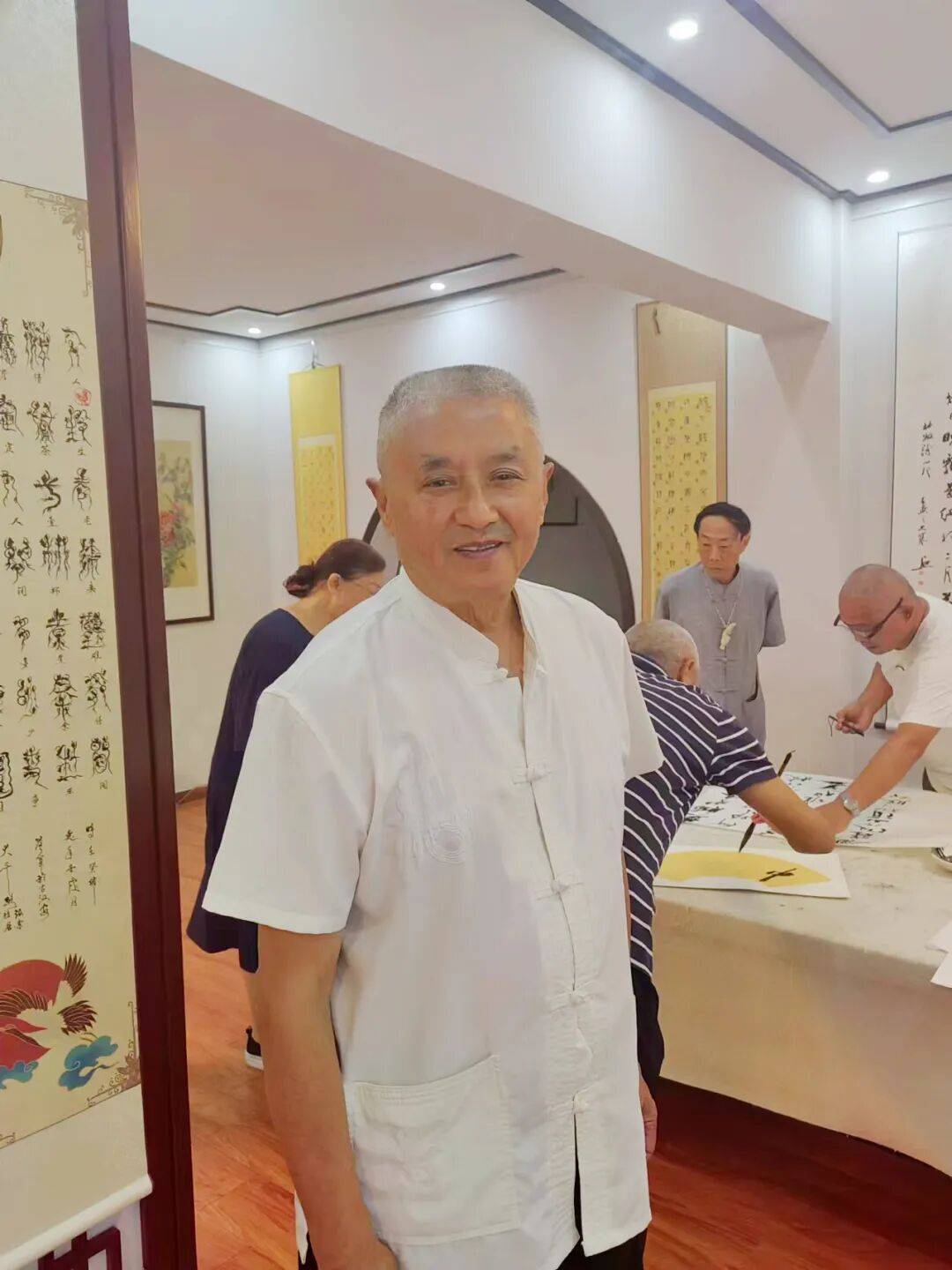 有一次,张老师对我说,好久把你介绍到朝阳茶馆去。我欣然期待。隔些时,事有凑巧,别的朋友相约,我们走进了位于城东的朝阳茶馆。我没提前告诉张老师,我想给他一个惊喜。谁知张老师那天并没出现在茶馆,他去外地避暑了。等他避暑回来,我们在茶馆里相见,彼此开心地笑了。那天正逢茶馆有书画创作活动,在其他师友笔走丹青的背景中,我为张老师拍了一张照片。这张照片,我们都还比较满意。