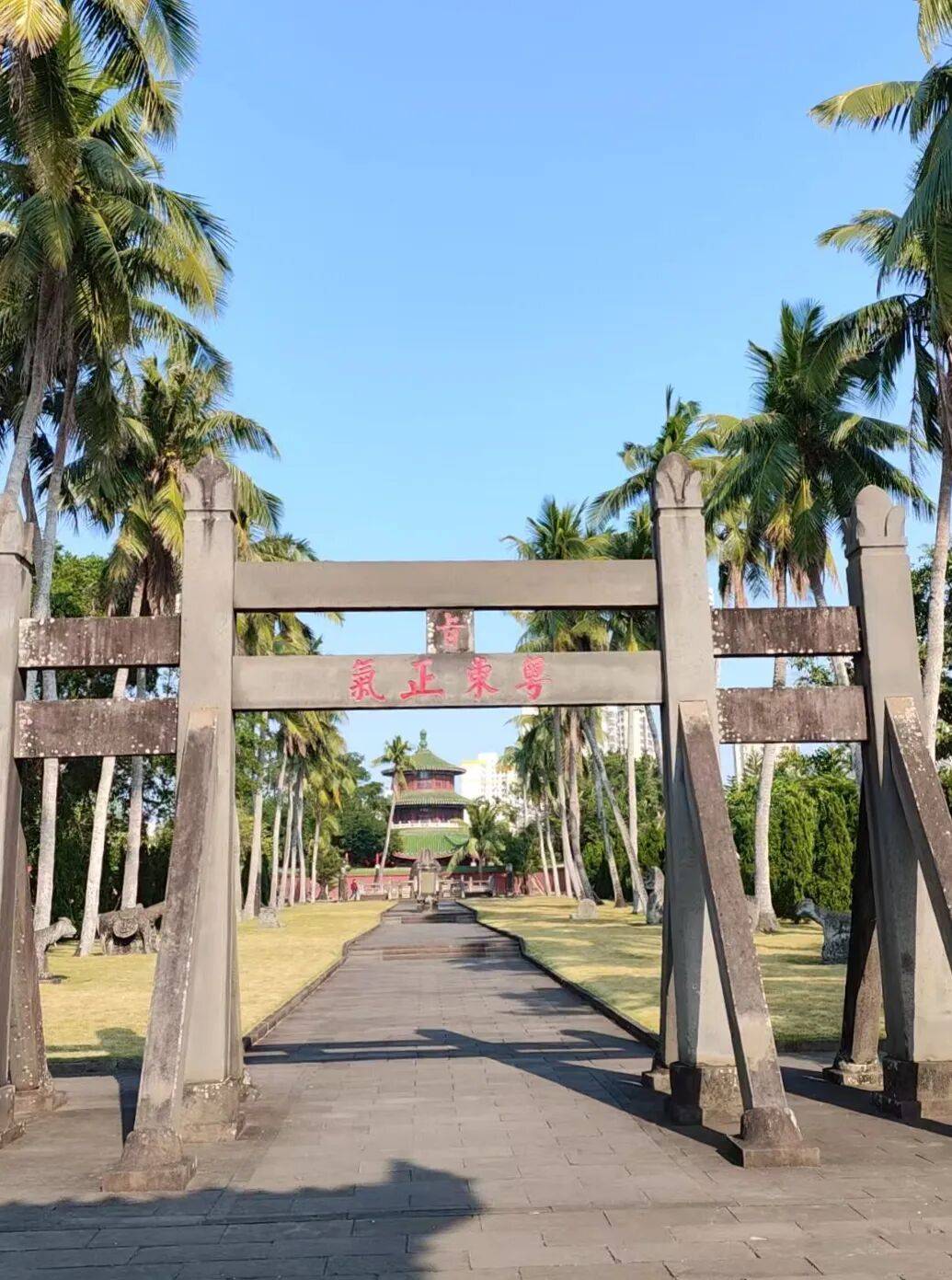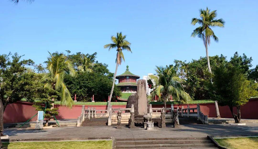 史书记载,“万历十五年(1587年),海瑞卒于官,当地小民罢市,丧出江上,白衣冠送者夹岸,哭奠者百里不绝。”人们哭葬海瑞,这便是对清官最隆重的加冕。展厅里,用现代影视画面展现出了这一悲壮场景,像把时间、空间拉回了当时,让我看得热泪盈眶。海瑞墓位于海瑞文化公园西侧,坐东朝西。墓前高耸两株已成活四百年的椰子树。据说这是当地群众自发栽植的“清官树”。海瑞去世后,明万历皇帝特派海瑞同乡许子伟由南京护送其灵柩回归海南,并督造坟茔。墓园立有“粤东正气”石牌坊,还有神道、谕祭碑、石五供及墓碑。墓冢用花岗岩砌筑成穹形,高3米。墓前石碑额上刻着“明皇敕葬”四字,正中阴刻“资善大夫南京都察院右都御史赠太子少保谥忠介海公之墓”大字。伫立墓前,我忽而想起鲁迅所说:“我们从古以来,就有埋头苦干的人,有拼命硬干的人,有为民请命的人,有舍身求法的人……虽是等于为帝王将相作家谱的所谓‘正史’,也往往掩不住他们的光辉。这就是中国的脊梁。”海瑞正是这光辉脊梁中的佼佼者。