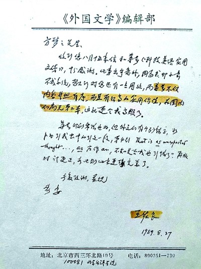 著名学者王佐良给方梦之的信 图片由作者提供