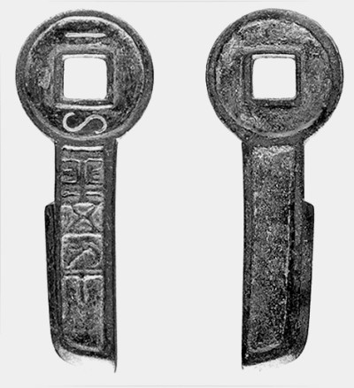 江苏扬州汉墓出土一面“今名之纪”四神博局镜,其铸造年代上限应是在西汉孺子居摄二年(公元7年)。其镜铭内容罕见:“今名之纪七言止,湅治(冶)铜华去恶宰(滓),铸成错刀天下喜,安汉保真世母(毋)有,长乐日进宜孙子。”“铸成错刀天下喜”,镜铭中的“错刀”是指西汉居摄二年王莽摄政之后铸行的大面额金属货币一刀平五千(图⑥)。《汉书·王莽传上》载:居摄二年,“五月,更造货:错刀,一直五千;契刀,一直五百;大钱,一直五十,与五铢钱并行。”“安汉保真世母(毋)有”,“安汉”是指安汉公王莽。西汉元始元年正月,太后乃下诏曰:“大司马新都侯莽三世为公,……以莽为太傅,干四辅之事,号曰安汉公。以故萧相国甲第为安汉公第,定著于令,传之无穷。”根据文献所记金错刀的铸行年代,可以推测出这面铜镜铸造的大致年代。