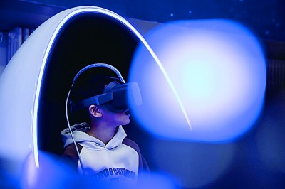 游客在哈尔滨的冰雪元宇宙体验中心体验虚拟现实(VR)冰滑梯。新华社发