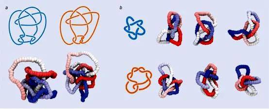 20世纪70年代,科学家发现了许多在拓扑意义上形成纽结结构的蛋白质(Knotted protein,也称打结蛋白),它们的天然结构呈现为开放的纽结,即两端不连接。尽管几何意义上,蛋白质(甚至DNA)可以看作一条(或几条)不闭合的曲线,但它们仍能形成纽结,从而影响其功能。事实上,在蛋白质数据库中,大约1%的蛋白质包含纽结结构。与绳子或线不同,每一个纽结蛋白质都具有一个特有的纽结。纽结蛋白质中最大的一类是SPOUT酶(它们组成了七类不同结构的甲基转移酶中的第二大类)。除了一种例外,其余所有SPOUT酶都形成了“三叶结”——三个环相互重叠的结构。纽结理论中目前最大的未解之谜仍是寻找完全不变量。现在,既然有了AI的助力,下一步的进展可能让我们感到惊讶。