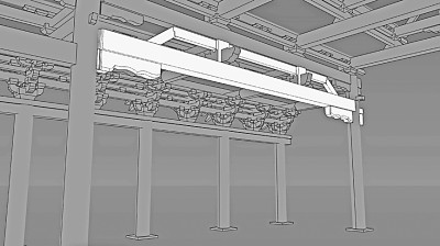 这里其实存在着建筑的一层“窗户纸”,我一直怀疑金代的匠人是不是已经把它捅破了。这就是看建筑受力的情况有几种荷载。一个是来自上层屋面的荷载,通过两个点传导下来,一个是下面那一对,两根乳栿压在了侏儒柱的下方。如果上面的荷载通过两个斜撑传递到由额两侧,侏儒柱两边的荷载集中压在了下面的由额之上,那两根侏儒柱可能受压,也可能像桁架结构里面的连杆一样受拉。我不知道当时的匠人有没有意识到这一点,有没有在细节榫卯的设计上一反常态,让侏儒柱下方在受拉的情况下,帮助拉起下面的由额。