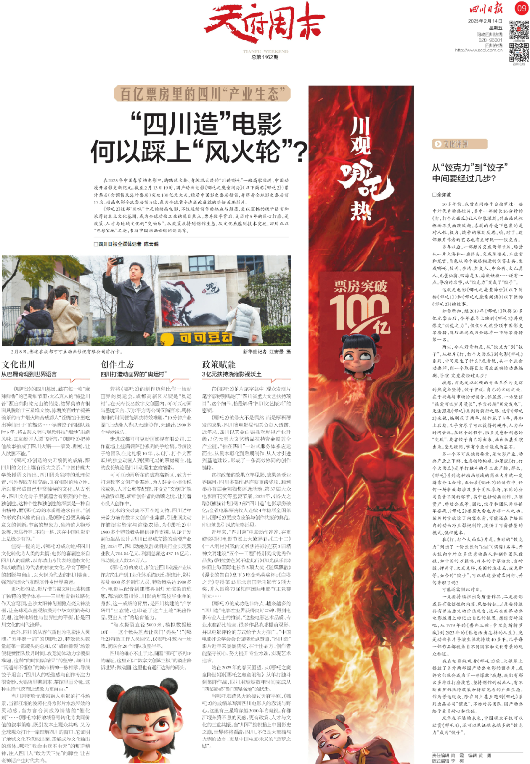 我想,首先是以过硬的专业素养为支撑的热爱与坚持。饺子曾说,自己的幸运之处,在于兴趣与市场恰好契合。但显然,一味坚信“热爱可抵岁月漫长”,单靠兴趣“用爱发电”,无法照亮《哪吒》系列的前行之路。就拿《哪吒2》来说,编剧花了两年,制作花了3年,再加上后期,几乎穷尽了可以获得的硬件、人力和时间资源。在这个过程中,很多灵感和创意的“变现”,要靠饺子自己写出来、画出来甚至演出来。毫无疑问,唯有专业才能成为基石。