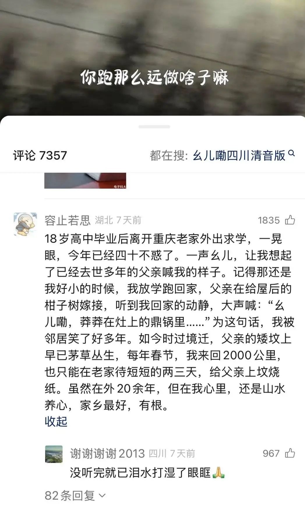 这些亲切的川渝乡音,在一声声絮叨中,迅速触动成千上万在外打拼的川渝乡亲们的灵魂深处,引发共鸣。迅速地,该条视频下,迎来了7000多条留言,其中有很多人在评论区分享自己与亲人之间的故事: