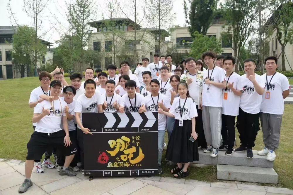 饺子导演(前排左三)和参与《哪吒之魔童闹海》(《哪吒2》)制作的四川传媒学院部分师生合影。从动画特效、制片到配音,四川传媒学院多位师生参与了该电影的制作(资料照片,新华社 发)