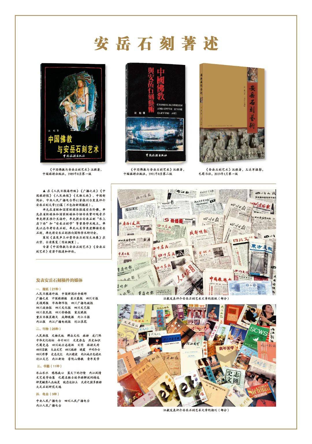 汪毅的文化情怀根植多年,创作和研究涉猎广泛。他曾任内江张大千纪念馆首任馆长,在张大千(大风堂)研究领域颇具影响力,曾出版8本著述,发表逾100篇文章;在对安岳古今人物研究方面,他研究对象达14人,特别是《汤绍恩述评》一书,影响了绍兴,促进了汤绍恩纪念馆建设;在文学创作方面,他出版有诗集、散文集6种;在对地方志研究方面,他不仅著有《方志四川》《我与地方志20年》,而且在《中国地方志》等学术期刊发表逾20篇文章;在安岳石刻研究方面,他不仅在海内外发表有约120篇文章,出版有《中国佛教与安岳石刻艺术》《安岳石刻艺术》专著,而且安岳石刻的若干“第一”均与他有关,故他被誉为安岳石刻学的“奠基者”。