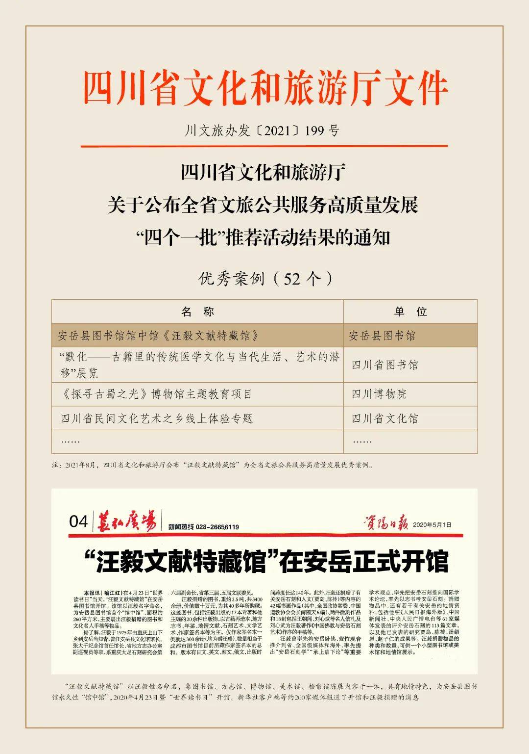 汪毅的捐赠并非一时兴起,而是他对“独乐乐不如众乐乐”理念的践行。他坦言:“书籍是生命的种子,与其藏于私室,不如惠泽社会。”这一善举和模式,不仅为安岳增添了一座文化宝库,而且有助于四川公共文化服务高质量发展。汪毅文献特藏馆开馆一年后,被四川省文旅厅公布为全省文旅公共服务高质量发展“优秀案例”,为县级图书馆开设“馆中馆”吹响了先锋号。