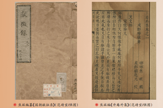 焦竑20余岁时杨慎去世,二人生活的时代相去未远。尽管焦竑可视为王门后学,但杨慎的学术精神对他产生了直接影响。焦竑对杨慎的关注与崇敬是自发而深刻的,这促使他在一生中全力搜集和整理杨慎的著述。《国史经籍志》收录杨慎著述31种,其中包括经类12种、史类2种、子类8种、集类及诗文评点类9种,均被《明史·艺文志》收录。由于杨慎被贬至云南,导致著述大量散佚并难以搜集,焦竑花费数十年时间,利用各种人脉才复得多种。在焦竑去世前两年,《升庵外集》终于辑刻完成。该集共100卷,收录杨慎著述38种,对当时流传的升庵著述进行真伪甄别和精华提炼,在诸多版本的升庵文集中质量极高。