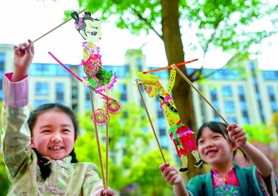浙江省湖州市安吉县实验幼儿园,小朋友正在体验皮影戏表演。光明图片/视觉中国