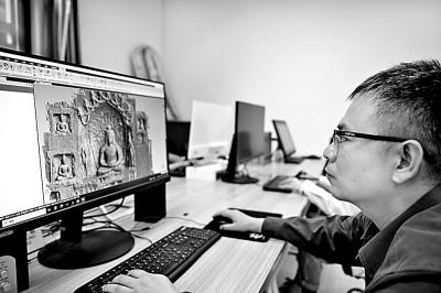 龙门石窟研究院工作人员在进行3D建模工作。新华社发
