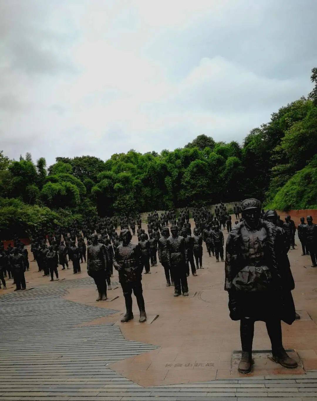 每一位英烈都是一座丰碑,他们向游人默默讲述那段惊天地泣鬼神的抗战风云录。壮士们集结成阵,这是钢铁之阵,威武之阵,团结之阵,胜利之阵。壮士们身后是一片青松翠柏,象征英烈精神不死,万古长青。
