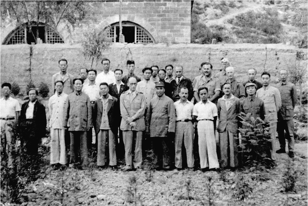 1944年6月,毛泽东等与中外记者西北参观团在延安王家坪的合影。