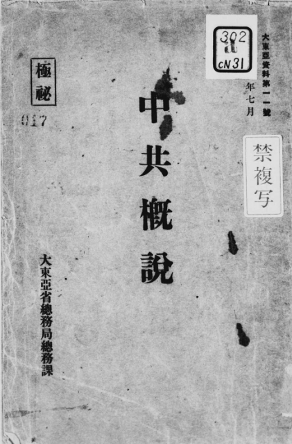 日本大东亚省总务局编《中共概说》书影,1944年(日本国会国立图书馆藏)。《中共概说》长达219页,全面而又详细地介绍了中共的组织建设、政治理论、政策策略、政权建设、军队建设、民众工作、经济建设、文化教育等。其中,对中共将马克思主义中国化给予了高度评价,认为在毛泽东领导下,中共将马克思主义与中国抗日战争的实践相结合,对马克思主义作了“创作式的自由解释”,变成了中国人易于接受的中国化的马克思主义,成为“中共新的政治纲领”,是“中共政治指导理论的集大成者”,是“中共意识形态发展史上的金字塔”。