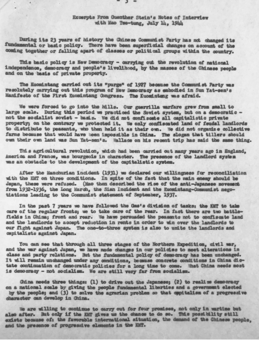 《冈瑟·斯坦因同毛泽东的采访摘要》,1944年7月14日,记录者:冈瑟·斯坦因(美国国家第一档案馆藏)。这是美国驻华使馆三秘谢伟思转呈的冈瑟·斯坦因同毛泽东的访谈记录。在斯坦因看来,中共对马克思主义的信仰并非因循守旧执念于马克思主义教条,而是一种“再发现”;中共对马克思主义的热忱并不是出于理论迷信,而是因为他们坚信,马克思主义哲学对他们政策的成功有非凡意义,中共的理论创新是“马克思主义的现实应用”。