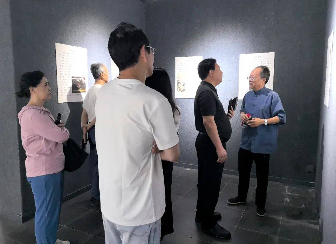 2025年9月6日上午,画家田旭中(右一)在画展上向参观者介绍画家王敬恒的绘画特色(蓬州闲士 摄,图源:四川方志图库)