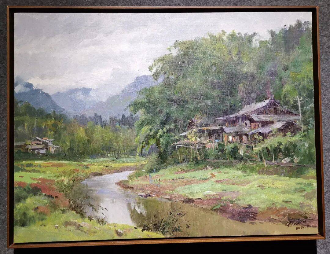 《溪畔人家》 布面油画 2021年 杜方晓 作(2024年2月16日蓬州闲士摄于迎新春2024成都画院年度美术作品展)