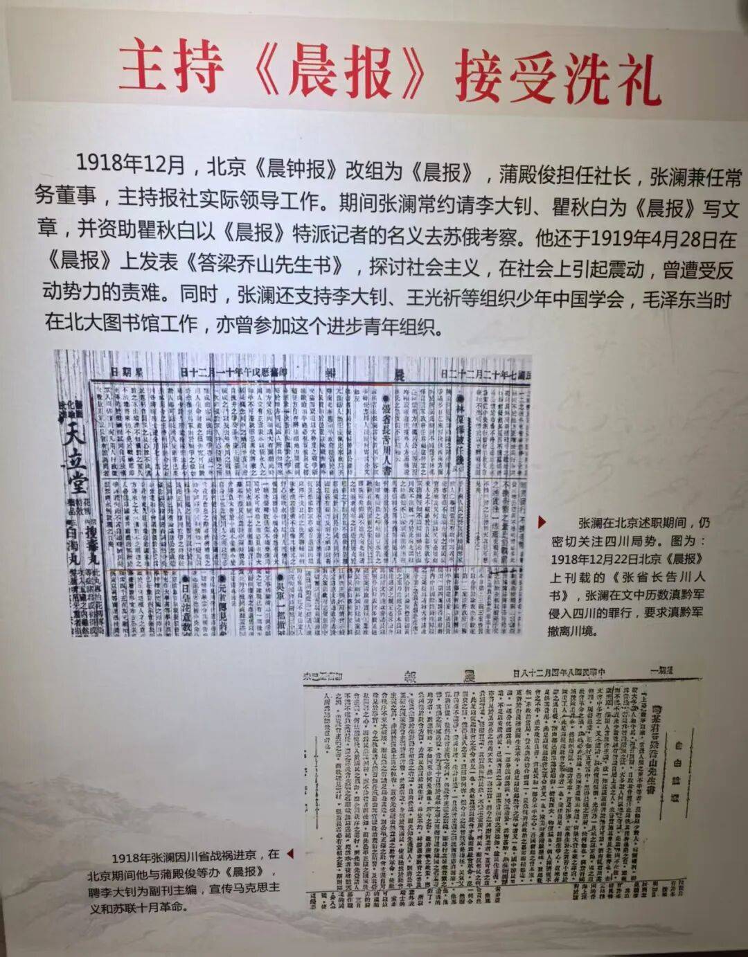 五四运动前后,张澜先生出任《晨报》常务董事,并聘请李大钊作副刊编辑,增设“自由论坛”“译丛”等栏目。他支持新文化运动,并在《晨报》上发表赞扬社会主义的文章。他与李大钊、陈独秀等新文化运动领袖保持密切交往,间接推动了马克思主义在四川的传播。