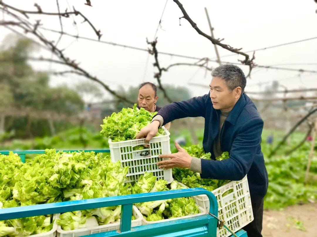 泸县返乡创业指导员、泸县得胜镇罐顶山村紫桂缘家庭农场负责人杜相南(右一)将轮作丰收的儿菜装车