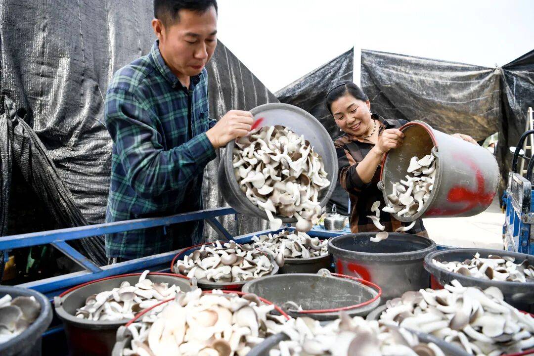 四川省返乡入乡创业明星、泸州菌林农业科技有限公司董事长李云川(左一)与员工一起采收秀珍菇