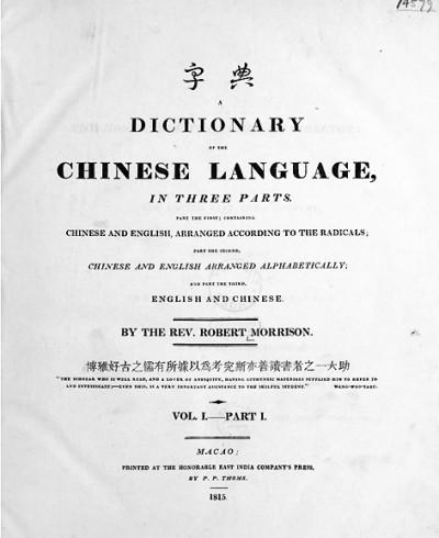 至于《华英字典》,1815年出版了第一卷,书名是《字典》,这是马礼逊根据嘉庆十二年刊刻的《艺文备览》英译的,汉英对照。第二卷第一部在1819年出版,书名是《五车韵府》。第二卷第二部在1820年出版,附录中特别列出了中文的楷书、行书、草书、隶书、篆书、古文6大类书写方法。第三卷在1822年出版,书名是《英中字典》,内容包括单字、词汇、成语和句型的中英对照,例句都有中文译文。整部《华英字典》在1823年出齐,共有六巨册,合计4595页,工程浩大,全由马礼逊一人经过13年的积累和编纂而成。