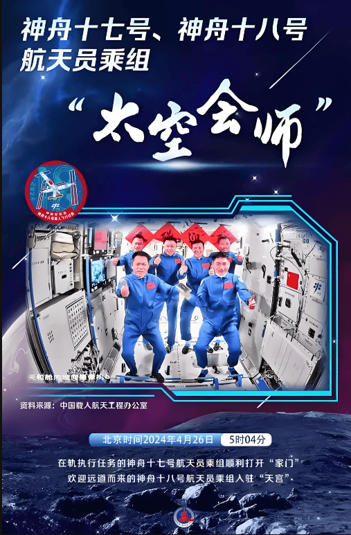 2024年10月30日,神舟十九号载人飞船成功发射,神舟十八号航天员乘组顺利打开“家门”,欢迎远道而来的神舟十九号航天员乘组入驻中国空间站,“70后”“80后”“90后”航天员齐聚“天宫”,在鲜红的“欢迎队友”横幅标语下,胜利完成了中国航天史上的第五次“太空会师”。太空舱里的五星红旗,每个航天员胸前的国旗,定格出一张中国红映衬下的两个航天员乘组的“全家福”,中国红骄傲地闪耀在蓝色星空。