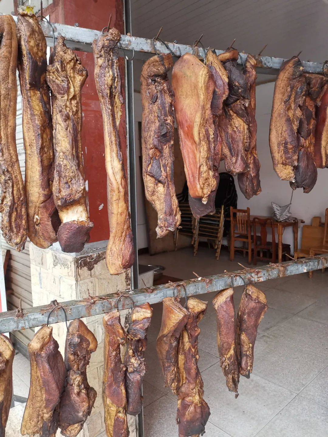 十天后,腌制完成的腊肉迎来晾晒环节,被挂在通风、阳光充足的地方,接受自然的洗礼。阳光下,腊肉的颜色由浅变深,直至成为诱人的深棕色,这是婆婆用时间和耐心雕琢的杰作,散发出的迷人香气,为冬日增添了一抹温馨的色彩。