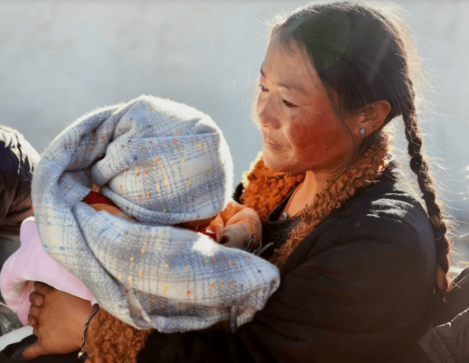 2025年1月8日,定日县长所乡通来村的受灾群众措姆抱着自己的孩子在领取志愿者送来的御寒衣物(新华社记者 姜帆 摄)